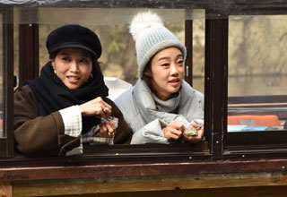 一行は韓国最大の発行部数(約10万部)を持つ女性雑誌「インスタイル コリア」専属モデルで、 テレビドラマでも活躍しているチェ・ヨジンさん(34)と、オ・ユナさん(37)ら8人。初日は一関市東山町の名勝猊鼻渓でこたつ舟を体験。 雪と岩が織りなす絶景を堪能し、岩場に開いた穴に「うん玉」を投げて占う運だめしなどを楽しんだ。